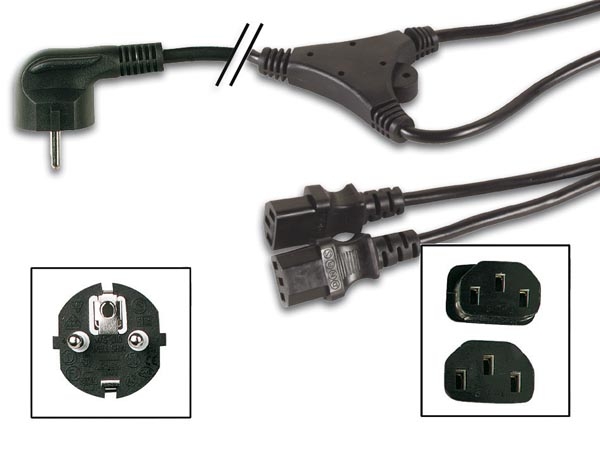 Y-apparatkabel jordad vinklad CEE 7/7 till 2 st raka IEC 60320 C13 max 250V/10A, Strömkabel / Strömdelare